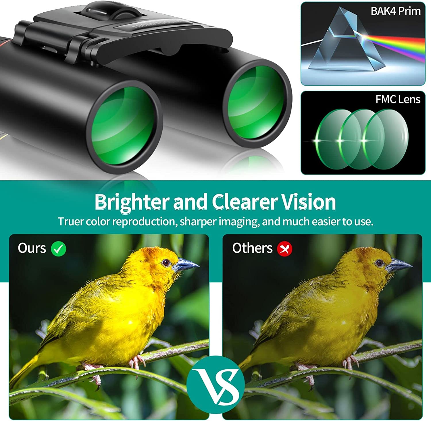 - Clear Comfortable Vision: 12X25 compact binoculars use premium Bak-4 prisms and optics for a truer color reproduction and sharper viewing image. When you look through these binoculars, you will see a natural color image at 12x magnification.